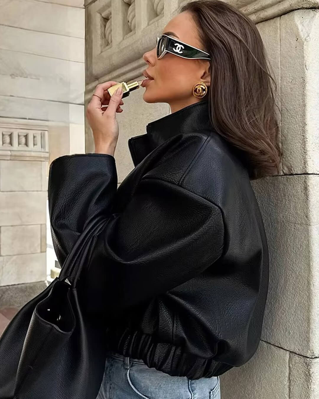 This Sylvia Zip Up Leather Jacket keeps you effortlessly cool while delivering durability and all-day comfort. Upgrade your style with our Premium Black PU Leather Jacket, crafted to deliver the perfect combination of modern fashion and day-to-day comfort. This versatile piece features a flattering loose fit, sleek stand collar, and long sleeves for a confident look that suits any season. Made from high-quality polyester and PU leather, it offers durability, a smooth texture, and a polished finish that elevates your outfit effortlessly. Ideal for everyday wear, night outs, travel, or statement street style. Wear it over your favorite tee or hoodie for easy layering. A timeless outerwear essential that gives you unstoppable confidence wherever you go.